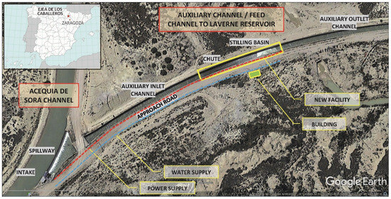 The new experimental facility has been developed in the auxiliary inlet channel of the Acequia de Sora channel (Figure 1), immediately upstream of the Laverné reservoir in Ejea de los Caballeros (Zaragoza, Spain). From the Acequia de Sora channel, a maximum discharge of 7 m3 s−1 can be supplied to this facility (eventually, up to 9 m3 s−1).
