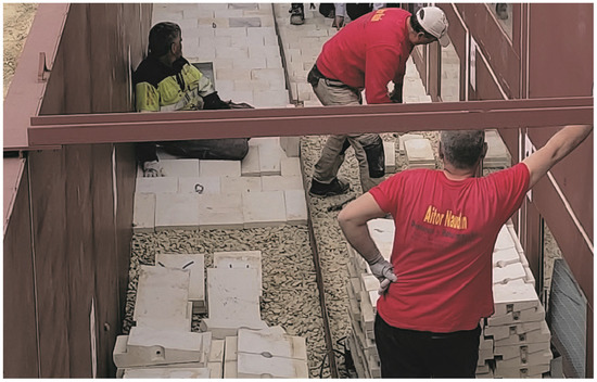 The WSBs were placed in horizontal rows, starting from the bottom row (row #1) and working upward. WSB placement used a staggered configuration of longitudinal joints among the blocks. To achieve the staggered pattern, half-pieces of WSB were placed at the end of alternate horizontal rows, as shown in Figure 8.