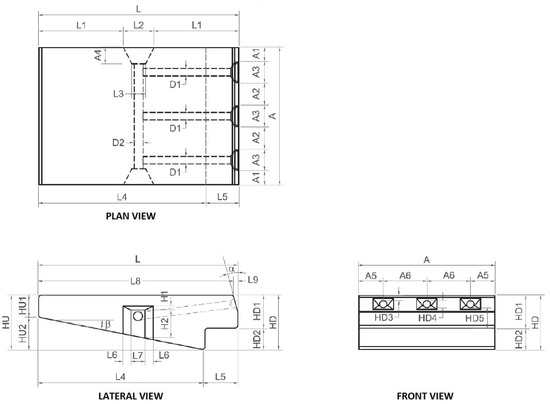 Performance of WSBs has previously been studied by Moscow Institute of Civil Engineering [3,4,5], the Construction Industry Research and Information Association (CIRIA) [3,6,7,8,9,10], Colorado State University, the Bureau of Reclamation [11,12,13,14,15,16], and the Instituto Superior Técnico [17,18,19,20,21], among others [22]. Recently, a new model of wedge-shaped block of precast concrete has been developed (ACUÑA, Spanish patent ES 2595852 B2). This model includes improvements in the aeration system from previous models based on numerical and experimental research performed under laboratory conditions [23,24].