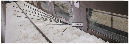 Picture of the intermediate wall dividing the two areas with different WSB sizes and eyebolts installed on some of the WSBs for block-extraction tests.