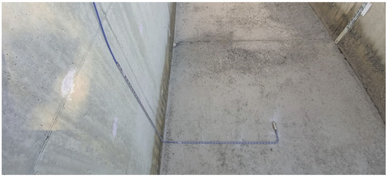 The pressure channel was designed to have the highest water elevation in the tower supply (Figure 3b), with negligible head loss for test flows and sectional capacity. The pressure channel is 38 m long and consists of a simple lining of the existing channel using lightweight precast concrete slabs (except at the end of the pressure channel close to the tower supply, in which the last two slabs are replaced by metallic plates) (Figure 4a–c). The concrete slabs are attached to the top of the side walls of the concrete chute and are supported by a rigid skeleton made up of metal beams anchored in the reinforced concrete of the existing walls (Figure 4d). A sealing treatment has been provided in the slab-slab and slab-pocket joints (Figure 4e).