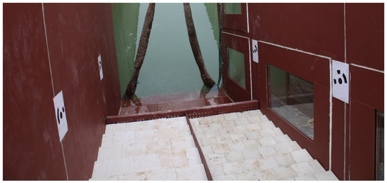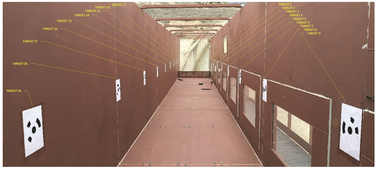 The movements of the blocks after each test session were measured by means of a comparison between 3D digital models of the external surface of the initial and final state. Digital terrain models (DTM) were obtained from photographs with digital cameras processed by Agisoft PhotoScan Professional v.1.4.3. The assignment of scale and a reference system to the DTM required a series of known support points (targets) that must appear in the different frames. Therefore, 18 targets were generated and adhered to the side walls of the chute (Figure 11). Nine were installed on the right wall of the chute, numbered from 1 (downstream) to 9 (upstream), and the other nine were installed on the left wall of the chute, numbered from 11 (downstream) to 19 (upstream).