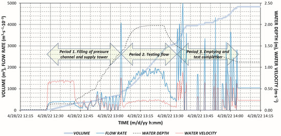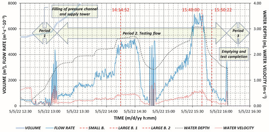 The inflow hydrograph and the time series of water velocities, water depths, and water supply volume during this session are presented in Figure 13 with data registered every 5 s.