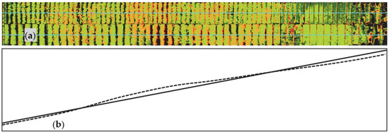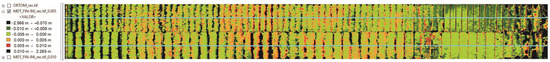 Figure 15 shows the displacements of the points that experience downward movements (from 0 to 5 mm in light green and from 5 to 10 mm in dark green) and upward movements (from 0 to 5 mm in orange and from 5 to 10 mm in red). In general, downward vertical displacement of less than 5 mm (light green) dominates, with some areas that reach 10 mm (dark green) and 20 mm.