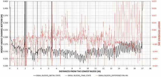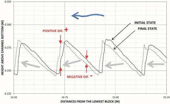 Figure 20 presents a scheme to help interpret the vertical differences between the original and the final DTMs presented above. Therefore, Figure 20 shows a detail of the longitudinal profile of four blocks that have experienced displacements (indicated with grey arrows in Figure 21) at the end of the test session 1, which illustrates the predominance of green (small negative differences in the upper faces of the WSB) and orange-red black (large positive differences at the downstream edges of the WSB). As can be observed, the armoring direction of the displacement of WSBs is mainly in the downstream-downward direction, as could be expected.