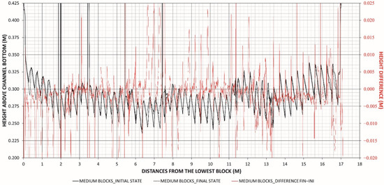 The longitudinal profiles of the WSB armoring in the initial and final states, and the differences between both are presented in Figure 18 (for the small WSB) and Figure 19 (for the medium WSB). The blue lines in Figure 15 show the position of the axes where the longitudinal cross sections were obtained.