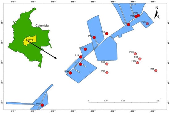 The study was carried out in a rural settlement located in the municipality of Villavicencio, Colombia, with geographic coordinates 4°04′25.7″ north and 73°35′13.9″ west, and lies at an altitude of 467 m.a.s.l. (Figure 1). The study area is associated by proximity to a higher education center (HEC) with around 7000 students. In physiographical terms, the area is located in the landscapes of mountain foothills with very heterogeneous geological features; lithologies consist of sandstone and shale in mountains, while clays, conglomerates and mixed sediments predominate in piedmont areas [36]. Its average temperature ranges between 21.0 and 31.5 °C, with 80% average relative humidity [37]. Two climatic seasons are presented, rainy and dry seasons, which begin in March or April and end in November. The other months are dry or receive little rain. The area is used mainly for agricultural activities, where 73% of the residents own properties, 14% rent and 13% are unaware of this information [38]. Agricultural uses include pastures for livestock production (42.9%), palm oil (22%), rice (19.4%) and cultivation. The remaining 0.5% is related to other production types [39]. The area also has savanna vegetation. The groundwater level is close to the surface at a depth of 4–17 m, presents a natural recharge level of 600 mm/year and the surface runoff is estimated at 2871 mm/year. However, currently, hydrogeological studies in the region are scarce [40]. Consequently, only some soil types have formed under the influence of water (hydromorphism). In the study area, the most frequent soil types are Oxisols, Inceptisols and Entisols [41].