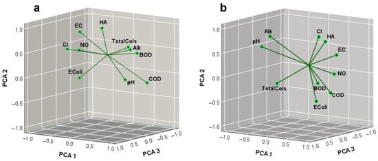 Table 5 and Figure 2 show that the HEC PC1 was strongly dominated by the alkalinity (0.77), BOD (0.76), pH (0.74), COD (0.64) and total cols (0.57), which indicates that groundwater quality is influenced by the activities that take place on campus, while in the households, the PC1 was dominated by NO3 (0.97), EC (0.84), BOD (0.80), E. coli (0.75) and total hardness (0.60). While in the PC2 for the HEC, the Cl, EC and total hardness are the ones that dominate and, in the households, the dominant in the PC2 is Cl (0.82) used as a mechanism to improve the water quality. Finally, the PC3 in the HEC is dominated by E. coli and in total cols (0.91) in households. In general, the results show that the quality of water in homes is associated with poor sanitation caused by contamination.