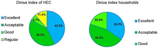 The application of the DQI pointed out that most of the water samples in the HEC entered the “Excellent” category with 42.9% (for recreation and fishing and aquatic life activities), while 40% is classifiable as “Acceptable” and 5.7% as “Good” if use is related to industry and agriculture activities. Only 11.4% were “Regular” for drinking water. Conversely, in households, the “Acceptable” category predominated with 36%, where the indices qualified for use in agricultural and industrial activities that require light conditioning treatments. In this group, they were qualified in the “Excellent” category with 28% for recreation and fishing and aquatic life activities, followed not very far behind in third place by drinking water and 20% for the “Regular” water quality category. Finally, ranges were “Good” with 16% of the total (Figure 3).