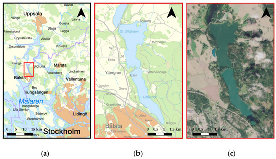 (a) Overview map showing the location of the lakes, shared by Stockholm County and Uppsala County, Sweden © Lantmäteriet; (b) Lilla Ullfjärden is an innermost cove of Lake Mälaren entering Stora Ullfjärden which empties into the next basin of Lake Mälaren © Lantmäteriet; (c) Satellite image from 31 August 2021 showing dark waters north of Stora Ullfjärden, Stora Ullfjärden with some cyanobacterial bloom, and Lilla Ullfjärden with a strong bloom. Original images: ESA Copernicus Sentinel Data, Syke [19].