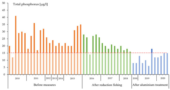 Total phosphorus concentration in Lake Växjö before measures (year 2010–2015), after reduction fishing (year 2015–May 2018) and after aluminum treatment (May 2018–2020) [28]. The red dashed line indicates the limit of good status (15.2 µg/L) in the lake with respect to total phosphorus.