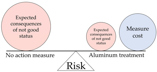 Figure 4 shows how the input data (Table 6) is used in the Bayesian decision analysis to determine the cost for a not good status, which result in the alternatives “no measure” and “aluminum treatment” to have an equal risk. If the cost of a not good status increases further than shown, aluminum treatment will be the option with the lowest risk.