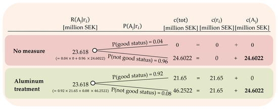 The inputs needed for the Bayesian decision model to calculate the cost of not achieving good status are the probability of good status and measure cost (start-up cost + operating cost). The lake restauration measure with the lowest total risk is chosen (Equation (7)), which constitutes aluminum treatment, see also Section 3.1.3. The input to the analysis is presented in Table 6.