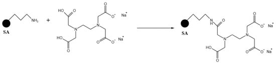 The work of grafting the carboxyl was implemented according to previous research [], and the reaction principle is shown in Figure 1. First, 0.5 g of amino-modified SA was dispersed in 80 mL of EDTA-2Na in water (0.1 M) and stirred for 24 h at room temperature. The samples were then centrifuged, rinsed with distilled water, and dried overnight at 60 °C to obtain the EDTA-2Na-modified SA (SA-COOH).