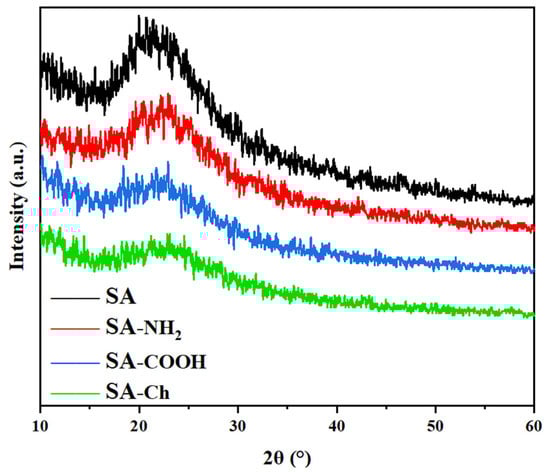 Figure 2 shows the XRD patterns of the original SAs and modified SAs. It could be seen that there was no sharp diffraction peak observed for all SA samples, only a wide peak between 20–30°, which is a typical characteristic peak of amorphous silica, proving the amorphous structure of the SAs [,,]. It was found that the intensity of the diffraction peak of the modified SAs decreased to a certain extent, which was probably caused by the coating of the modifiers on their surface.