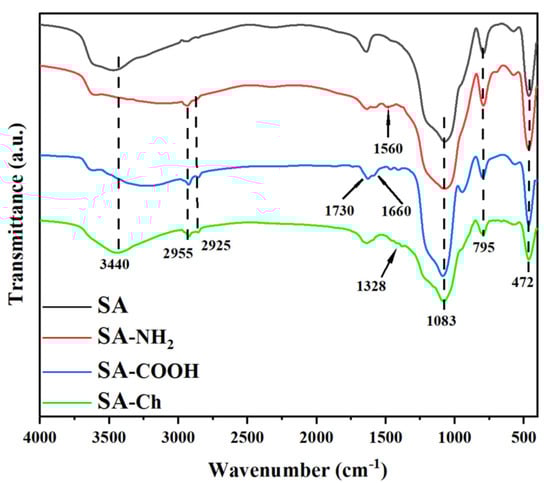 Figure 3 shows the FT-IR patterns of the original SA, EDTA-2Na aerogel (SA-COOH), APTES aerogel (SA-NH2), and chitosan aerogel (SA-Ch). It could be seen that the band around 3440 cm−1 formed characteristic peaks, which were attributed to the telescopic vibration of -OH. The peaks around 1083 cm−1, 795 cm−1, and 472 cm−1 were the asymmetric telescopic, symmetrical, and bending vibrations of the Si-O-Si bonds, respectively [], typical peaks of SAs [,,]. In the atlas of the modified SAs, it could be seen that the peaks around 2955 cm−1 and 2925 cm−1 were attributed to the symmetrical and asymmetric telescopic vibrations of the -CH3 bonds and -CH2- bonds, respectively []. The characteristic peaks around 1560 cm−1 were attributed to the bending vibrations of the N-H bonds, indicating that the amino group was successfully grafted onto the surface of the SAs. The strong peak around 1730 cm−1 could be attributed to the contraction vibration of the C=O bonds []. The characteristic peak around 1660 cm−1 could be attributed to the contraction vibration of the C=O bonds of the amide group, which is the main band of the amide ligand, indicating that the carboxyl group was successfully grafted onto the surface of the SA []. The characteristic peaks around 1328 cm−1 and 3430 cm−1 were attributed to the bending vibration and telescopic vibration of the N-H bonds in chitosan, respectively, indicating that chitosan was successfully grafted onto the surface of the SA.