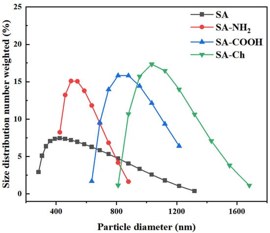 Average particle diameter of SA, SA-NH2, SA-COOH, and SA-Ch.