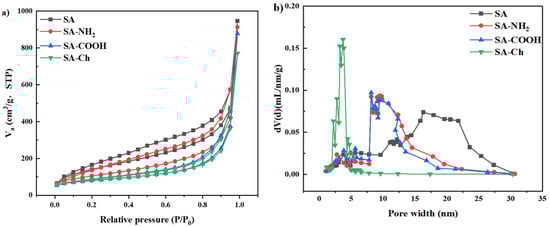 Figure 6 shows the adsorption–desorption isotherm and pore-size distribution of the SA samples. According to the classification of IUPAC, the samples revealed an IV adsorption isotherm; this increases sharply at larger levels of P/P0 and the formation of hysteresis loops can also be observed [,,]. These isotherms resemble H2-type hysteresis loops, which are characteristic of complex networks of major mesopores that may have bottleneck-type pores. Table 2 shows the textural parameters such as the specific surface area, average pore diameter, and total pore volume for the different SA samples. It could be seen that all samples had a large specific surface area and an average pore diameter and total pore volume, indicating that they had a good adsorbent structure. The modified SAs had a lower specific surface area than the original SA, which may have been caused by a large number of functional groups grafted onto the SA. The average pore diameter and total pore volume of the modified SAs were also smaller than those of the original SA, which confirmed that the functional groups such as amino groups and carboxyl groups were also grafted onto the internal pores of the SAs.