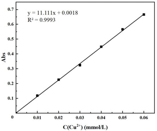 As DDTC and Cu2+ undergo a color reaction in an alkaline environment [], the principle of a color reaction between DDTC and Cu2+ is shown in Figure 7. It could be seen that the molar ratio of Cu2+ to DDTC in the chromogenic reaction was 1:2, so an excess DDTC solution was generally used to measure the remaining Cu2+ concentration. The NH3-NH4Cl buffer solution was used to ensure the stability of the reaction system at a pH of 8~10. The formation of yellow stable substances and the uniform and stable presence in the reaction system could be directly detected by spectrophotometry at the wavelength of λ = 452 nm. The effective detection range was 0.011~0.071 mmol L−1, which was in accordance with the Lambert–Beer law. Figure 8 shows the absorbance standard fitting curve measured by 0–0.6 mmol/L copper ions under monochromatic illumination at the wavelength of λ = 452 nm. The relationship between the absorbance (y) and copper ion concentration (x) in this range was calculated by curve fitting as y = 11.11x + 0.0018 (R² = 0.9993), so that the copper ion content in water could be calculated according to the measured absorbance.