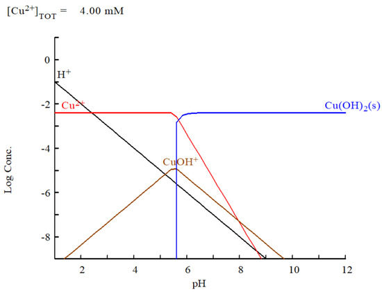 To clarify the behavior of the copper ions in the solution and to facilitate the subsequent experimental design, the MEDUSA program was used to determine the presence of copper ions at the tested pH range. Figure 9 shows the presence of copper ions at a concentration of 4 mM (approximately 250 mg/L) at different pH values. It could be clearly seen that when the pH value was smaller than 5.7, the existence form of the copper ions was mainly Cu2+ and there was a small amount of CuOH–; the content of CuOH– gradually increased as the pH value increased. When the pH value was greater than 5.7, the content of Cu2+ and CuOH– in the solution began to decrease and Cu(OH)2 precipitation occurred. When the pH value reached 6, the amount of precipitation reached the maximum. When the pH value reached 8.8, Cu2+ could not exist in the solution and was basically converted into a Cu(OH)2 precipitate. This showed that the copper ions mainly existed in the form of Cu2+ in the acidic environments (Equation (2)) and Cu(OH)2 in the alkaline environments (Equation (3)), which could be expressed as: