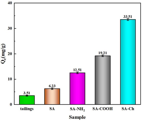 In order to study the adsorption capacity of different types of adsorbents, gold tailings, SA, SA-NH2, SA-COOH, and SA-Ch were added to the solution with a copper ion concentration of 100 mg/L. The pH of the solution was adjusted to 7 and the adsorption was 2 h at room temperature. It is evident from Figure 10 that SA-Ch had the best adsorption performance; its maximum adsorption capacity for Cu2+ was 33.51 mg/g. The good adsorption performance of SA-Ch was mainly attributed to the grafting of a large amount of chitosan onto its surface, which was related to the rich hydroxyl groups and amino groups on the surface of chitosan [], providing abundant attachment sites for the adsorption of Cu2+. As SA-Ch revealed the best adsorption performance, the follow-up studies were carried out on it [].