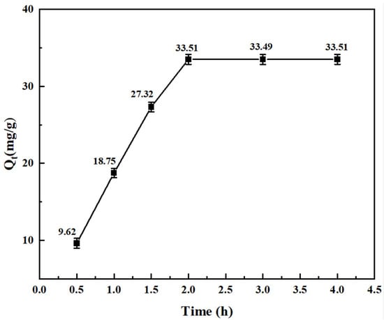Figure 11 shows the adsorption capacity of SA-Ch at different contact times. It could be seen that within 0–2 h, the adsorption capacity increased with the extension of the contact time. When the contact time exceeded 2 h, the adsorption process reached an equilibrium and the adsorption capacity no longer changed with the time. In the early stage of adsorption, the adsorption process mainly occurred on the surface of SA-Ch and the adsorption speed was faster because the surface was rich in hydroxyl and amino groups. With an increase in the contact time, the adsorption sites on the surface were gradually occupied by Cu2+ to reach saturation, the adsorption capacity almost did not grow, and the adsorption process reached an equilibrium. Thus, a contact time of 2 h was selected as the optimal contact time.