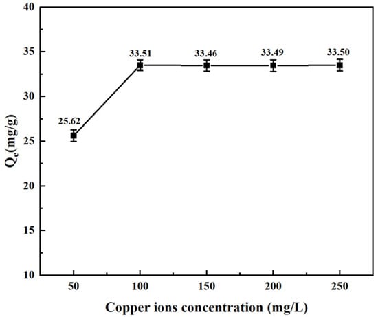 where (mg/g) was the equilibrium adsorption concentration of the copper ions, (mg/L) was the initial concentration of the copper ions, (mg/L) was the equilibrium concentration of the copper ions, (mL) was the volume of the copper ion solution, and (g) was the mass of the modified SA.