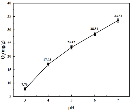 Figure 13 shows the adsorption capacity of SA-Ch in the copper ion solutions with different pH values. It could be seen that the adsorption capacity of SA-Ch to Cu2+ increased with an increase in pH. The low adsorption capacity of SA-Ch to Cu2+ under lower pH conditions was attributed to saturated H+ and Cu2+ competing for the adsorption sites, resulting in a decreased number of adsorption centers of Cu2+. In addition, the functional groups such as amino groups and hydroxyl groups showed protonation and electrostatic repulsion on Cu2+ also further reduced the adsorption capacity of SA-Ch on Cu2+. With an increase in the pH of the solution, the competition between Cu2+ and H+ was weakened due to the decrease in the H+ concentration, resulting in more Cu2+ being fixed on SA-Ch. In addition, under higher pH conditions, the bound H+ ions were gradually dissociated from the hydroxyl groups and carboxyl groups [], which enhanced their interaction with Cu2+ and further increased the adsorption capacity of SA-Ch to Cu2+. This showed that the adsorption of Cu2+ by SA-Ch was mainly due to the ion exchange and electrostatic gravity.