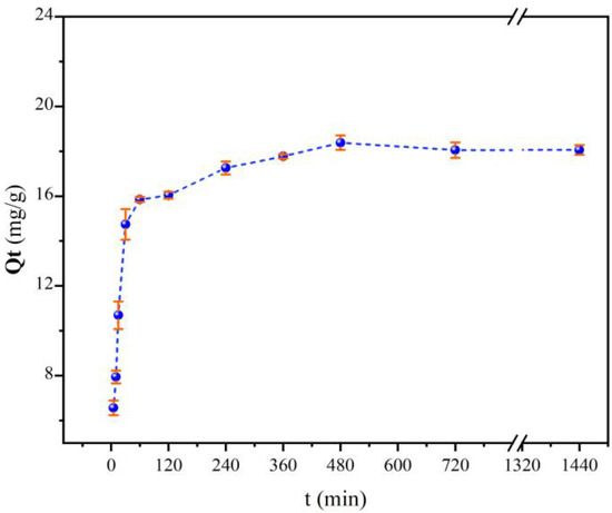 The sediment collected from station M19 was chosen to conduct the kinetic sorption experiments. A 200 mL volume of 30 mg/L TC and 0.2 g sediment were added to each Erlenmeyer flask. The pH of the solutions was maintained at 7.0 ± 0.1. In order to determine the equilibration time, the samples were shaken for 5, 10, 15, 30, 60, 120, 240, 480, 720 and 1440 min intervals at 20 °C in a GY2016-SW temperature-controlled shaking incubator (Changzhou Guoyu Appliance Co., Changzhou, China). Then, the samples were centrifuged at a speed of approximately 4000 rpm for 10 mins, using a centrifuge (Shanghai Anting Scientific Instrument Factory, Shanghai, China). The supernatant was filtered with a 0.22 μm organic filter and analyzed at 350 nm using an ultraviolet spectrophotometer (PERSEE, TU-1950, Beijing, China) according to a previously reported method [27]. A sorption equilibration time of TC on sediment M19 at 20 °C is shown in Figure 2.