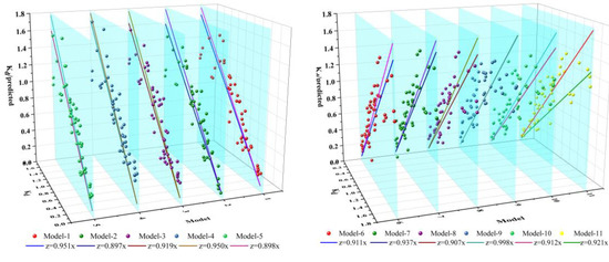 All 11 models shown in Table 4 were used to predict the Kd values of the 49 sampling sites. The Kd values obtained in our experiments were plotted against the predicted values. The results are shown in Figure 3. Herein, the linear fitting between the predicted and observed Kd values was performed using y = x as a reference [21]. It was observed that the predicted Kd values were consistent with the corresponding actual values, indicating that it is feasible to use the calculated values and the ten models to accurately predict the Kd values.
