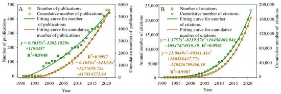 The number of global annual publications can reflect the general trend, hotness and development rate of a research field, as well as the attention from scientific communities [20,21]. We sliced the retrieved data from 1991 to 2021, year-by-year to reflect the pattern in the total number of publications and the annual publication impact over time.