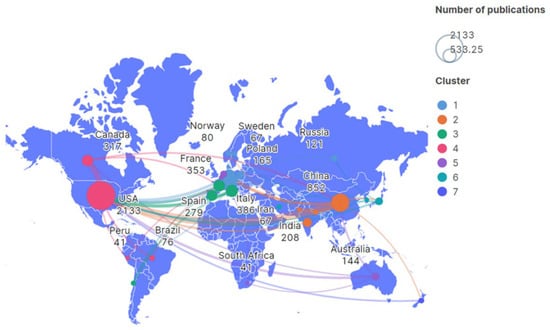 Number of publications by country and cooperation between them from 1991 to 2022.