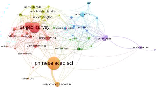 In terms of the number of publications in WOSCCD, the Chinese Academy of Sciences topped the list, with 327, accounting for 5.7% of the total. The United States Geological Survey ranked second with 267 publications, followed by Colorado State University, the University of the Chinese Academy of Sciences, and the University of Arizona (Figure 3). The cooperation relationship map shows the cooperation among the countries to which the publication belongs, with a thicker connecting line between two countries indicating more frequent cooperation. The USA is the most frequent collaborator with other countries, with the highest number of collaborations with Canada at 46, followed by 33 with the UK. China cooperated frequently with the USA, Canada, Australia and Japan. Sweden co-operated more with Norway, Belgium with France, and the Netherlands with Germany. Inter-institutional collaborative relationships were analyzed based on the number of collaborative publications greater than 30. The VOSviewer results show that the United States Geological Survey, the Chinese Academy of Sciences, the University of the Chinese Academy of Sciences, the University of Bern and the University of Geneva in Switzerland are institutions with the most collaborations with other institutions, having collaborative publication numbers of 151, 143, 115, 98, and 88, respectively.