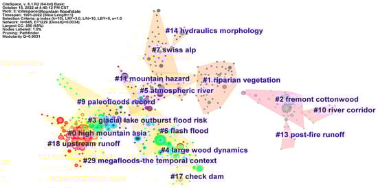 Co-citation network analysis and cluster analysis of literature are the core functions of the CiteSpace software and are the focus of this study. Based on the construction of citation networks in the mountain flood field, we explored the research history and development of this field from the time dimension. When two (or more) articles are simultaneously cited by one or more subsequent articles, these articles constitute a co-citation relationship, and the number of articles citing these papers is referred to as the co-citation strength. A literature co-citation network is a knowledge network consisting of two articles cited by other articles at the same time, where nodes represent literature citations; more nodes indicate more articles involved in this cluster—the higher the homogeneity, the stronger the relevance as well as the aggregation within the cluster. Connecting lines indicate literature co-citation relationships; nodes with high intermediary centrality are key pivotal literature for constructing connections in different fields. Co-citation cluster analysis is the basis of this function, in which cool color to warm color represents the time from far to near. The citation relationship of the literature can be used to derive the research hotspots in different time periods. Based on the literature in the WOSCCD, the modularity value of the cluster map of the co-citation network in the mountain flood field is 0.9031, which is much larger than 0.3, indicating good performance of the cluster network. The silhouette value of each cluster is larger than 0.7, indicating that these clusters are large and that the cluster structure is effective and convincing. The profile values, labels, and average years for the top five clusters are summarized in Table 2; Table 3 shows the top five most cited references in the top five co-citation clusters. The five main clusters of the literature co-citation network are #0 “high mountain Asia”, #1 “riparian vegetation”, #2 “fremont cottonwood”, #3 “glacial lake outburst flood risk” and #4 “large wood dynamics” (Figure 4).