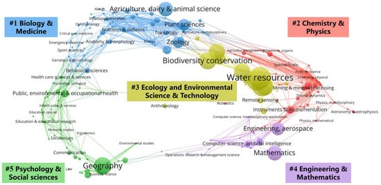 Each journal in the WOSCCD is divided into different scientific categories, indicating the scientific disciplines that have contributed to the field and the corresponding level of contribution [54]. The global scientific categories map of mountain flood field shows that the research in this field is further divided into five discipline categories: #1 “Biology and Medicine”, #2 “Psychology and Social Sciences”, #3 “Ecology and Environmental Science and Technology”, #4 “Chemistry and Physics”, and #5 “Engineering and Mathematics” (Figure 5).