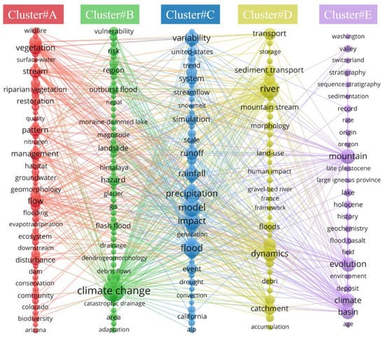 The thematic clustering of keywords is shown in Figure 6. Table 4 shows the keyword cluster analysis statistics based on Figure 6, containing the most common scientific categories in mountain floods based on keywords appearing more than 200 times, the associated clusters, as well as the average number and year of citation. These clusters provide a unique perspective on the broad range of topics of interest to mountain flood research. Early work of Cluster #A (red column in Figure 6) focused on specific hazard events in Colorado and Arizona, USA, and on ecological changes before and after a mountain flood. Recent work in this cluster has focused on landscape, conservation, and management. Cluster #B (green column in Figure 6) is associated with “Natural and Major Disasters”. The regional focus is mainly on China and New Zealand. Early work focused on obtaining information on mountain floods and their associated hazards in the context of climate change. As the research progressed, the focus gradually changed to mountain hazards, natural hazards, debris flow, landslides, etc., and geohazard assessment became a hot topic. Cluster #C (blue column in Figure 6) focuses on models; its central theme is model construction and disaster prediction, with an early focus on specific cases of mountain floods in the USA and other countries. Later, the focus shifted to technical tools, such as radar, remote sensing, model building, and attempted to establish quantitative relationships between precipitation, runoff, drought, climate variability and the magnitude of mountain flood events, as well as the monitoring techniques and prediction and early warning techniques of mountain flood events. Cluster #D (yellow column in Figure 6) deals with sediment transport with the central topics of erosion and dynamics. The early keywords were “floods”, “mountain streams”, “bedload transport”, “sediment”, “accumulation”, and “storage”, which later shifted to “sediment transport”, “erosion”, “transport”, “human impact”, etc. The process of mountain flooding is often accompanied by the transport and movement of sediment; therefore, the influence of human activities, such as land use, on the sand content of mountain floods, was also focused on. Cluster #E (purple column in Figure 6) is related to fluvial geomorphology, with the important keywords of “climate”, “basin”, “evolution”, “deposit”, and “valley”. Compared to the previous four clusters, this cluster has a lower number of keywords, publications and citations and has become less active in recent years. The cluster is mainly linked to cluster #3 “Ecological and Environmental Sciences and Technologies” in Figure 5, especially to the scientific categories “Environmental Sciences” and “Multidisciplinary Earth Sciences”.