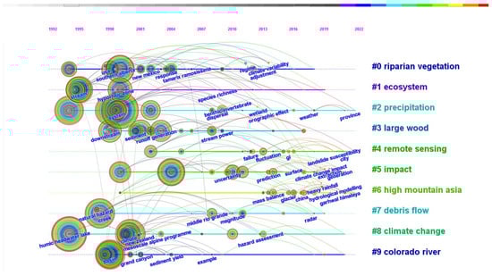 The years 2000–2013 show a centralized distribution of multiple research clusters and a concentrated burst, and several new frontier research branches have been derived in the mountain flood field based on the research in 1991–1999. The keywords that characterize the research frontier in this period are “green river”, “history”, “floodplain”, “record”, “stream”, “riparian vegetation”, and “accumulation”. In addition, ecosystem research clusters oriented to specific watersheds [57] and research clusters centered on field survey records [34] expand more, indicating that the research field was entering an active period, with branches of research shifting to applied research and tending toward specificity.