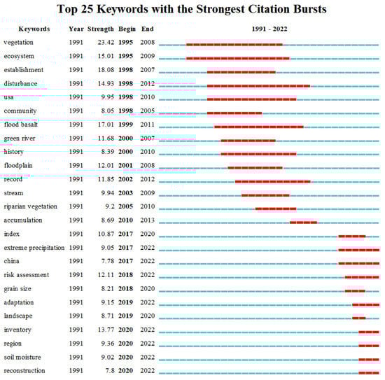 Timeline analysis can precisely characterize the temporal properties of co-citation clusters and help to uncover frontier hotspots of disciplinary development. Compared with traditional analysis of high-frequency words or keywords, burst analysis can more intuitively characterize the changing trends and development direction of disciplinary research based on the growth rate of the occurrence frequency of keywords in the title, keywords or abstract of the literature [55]. In this study, literature keywords obtained from the WOSCCD were analyzed for burst analysis using the “burstness” function in CiteSpace software with a time slice of one year, finally yielding the timeline map (Figure 7) and the keyword burst map (Figure 8). Figure 7 depicts the transitional phases and evolutionary trends in mountain flood study over the time span, which shows when the keywords appear and how they relate to each other through a horizontal analysis. Figure 8 shows the 25 focus keywords and their sequences sorted by burst start time, where the long red bars indicate the start to end time of a keyword. The research frontiers of mountain flood are substantially represented by four phases.