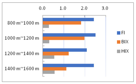 Figure 2 shows the variation in characteristic fluorescence parameters of DOM in geothermal water samples from the four thermal reservoirs (800~1000 m, 1000~1200 m, 1200~1400 m, and 1400~1600 m). It can be seen that the FI, BIX, and HIX values of DOM in geothermal water differ among these four thermal reservoirs. The average value of FI showed very little difference among the four thermal reservoirs, although the FI value of the reservoir between 1200 and 1400 m was slightly lower than that of the other three thermal reservoirs. The BIX values of the two thermal reservoirs, with a depth greater than 1200 m, were significantly lower than those of the two shallower reservoirs, indicating that the DOM in the shallower thermal reservoirs have more obvious autogenic characteristics. In general, as the depth increased, the contribution of self-generated sources to DOM increased slightly, and then decreased. Figure 2 shows that the HIX value of DOM in the four thermal reservoirs (800~1000 m, 1000~1200 m, 1200~1400 m, and 1400~1600 m) increased gradually, indicating greater humification of DOM in deeper geothermal water.