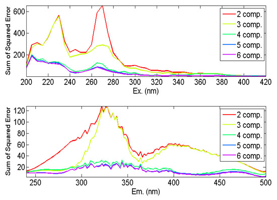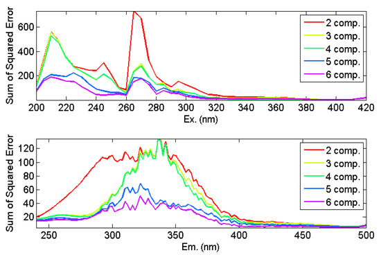 where Xijk is the fluorescence intensity of the ith sample at the kth excitation and jth emission wavelength, F is the number of components, akf are scores proportional to the concentration of the fth fluorescence component in the ith sample, bif and cif are estimates (loadings) of the emission and excitation spectra, respectively, for the fth fluorescence component, and σijk are the residual elements of the model. The values for akf, F, bjf, and cif are obtained by minimizing the sum of squared residuals (σ2ijk).