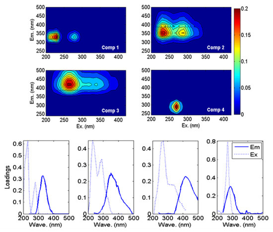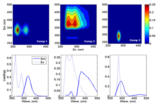 As shown in Figure 4, comp 1, a fluorescent component, has two excitation peaks and one emission peak, corresponding to low- and high-excitation tryptophan-like fluorescence peaks with excitation/emission wavelengths of 230/340 nm and 280/340 nm, respectively. Comp 2 has two excitation peaks and two emission peaks, corresponding to a fulvic acid-like fluorescence peak and a humic acid-like fluorescence peak, with excitation/emission wavelengths of 260/370 nm and 300/370 nm, respectively. The last fluorescent component, comp 3, has an excitation peak and an emission peak (the high-excitation tyrosine fluorescence peak), with an excitation/emission wavelength of 270/290 nm.