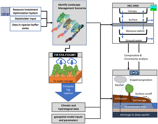 The synthesis modeling framework engaged stakeholders from project onset to direct the overall model framework and selection of intervention options, in addition to providing input data, scientific and management feedback on the model details such as the computational structure and framing of model outputs. Ultimately, four models were synthesized to provide inputs to a financial model for the CWSS that overlays full-lifecycle costing and projected economic benefits for nature-based solutions investment scenarios to estimate the economic cost of a drought [13]. The Resource Investment Optimization System (RIOS) was used to define the optimized scenario for maximizing infiltration and baseflow. The Fog Interception for the Enhancement of Streamflow in Tropical Areas (FIESTA) was used to incorporate a fog water input in the watershed. Finally, the Hydrologic Modeling System from the Hydrologic Engineering Center (HEC-HMS) and the Soil and Water Assessment Tool (SWAT) were used to estimate the NbS effects on watershed hydrology of different landscape scenarios.
