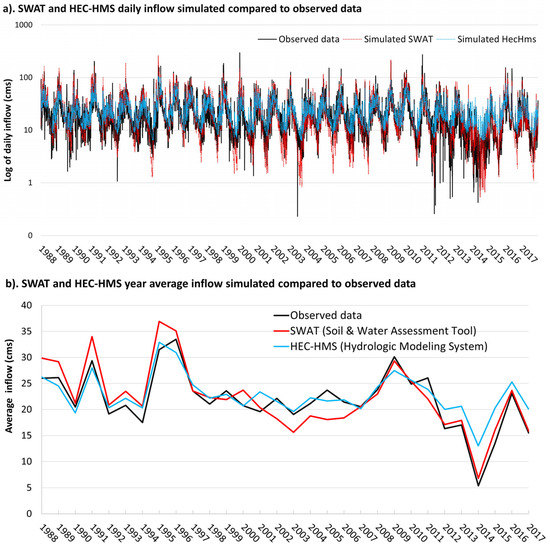Input data for both hydrological models (SWAT and HEC-HMS) include daily precipitation from several rain gauge stations from Sistema Nacional de Informações sobre Recursos Hídricos (SNIRH) and Instituto Nacional de Meteorologia (INMET), across the watershed (Camanducaia, São Francisco Xavier, Vargem, Crioulos, Nazaré Paulista, Morro Grande, Guarau e Guirra) starting from 1 January 1980 to 31 January 2018. Likewise, the models were calibrated using hydrological monitoring data from Companhia de Saneamento Básico do Estado de São Paulo (Sabesp) and Departamento de Águas e Energia Elétrica (DAEE). Daily reservoir inflow data (cms) were collected at the individual reservoirs (Jaguari-Jacarei, Cachoeira, Atibainha, and Paiva Castro) from 1 January 1984 to 31 December 2019, and at the stream gage on the Jaguari River (F25B Rio Jaguari) from 1 January 2008 to 31 January 2018. For the calibration step, daily flow data between 1 January 2004 and 31 May 2015 were selected, and for the validation of the model fit the period of 1 June 2015 to 1 January 2018 was selected. These choices were based on data availability.