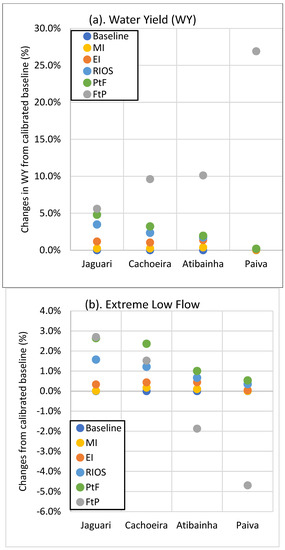 In general, the HEC-HMS long-term hydrologic simulation outputs indicate that the restoration activities result in declines in the extreme low flows and peak floods with marginal improvements in the annual water yields (WY) (Figure 6a). Among all scenarios, RIOS generally performs best to improve water quantity benefits in all watersheds. Among all watersheds, Jaguari-Jacarei shows most improvement with RIOS scenario. Other scenarios based on Forest code (MI and EI) show marginal improvements. The extreme case PtF, while showing only slight improvements in overall increase in WY, resulted in relatively larger improvements in mitigating extreme low flows and peak flows. Case FtP resulted in larger surface runoff, as the overall infiltration and ET rates decline with forest conversion to pasture, and an overall increase in WY while both low flow and peak flow events increase.