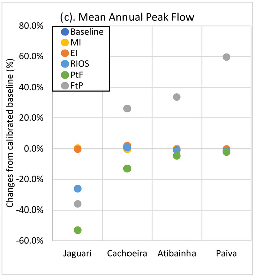 Long-term average changes in water quantity measures derived from the 30-year hydrologic simulation in Jaguari-Jacarei (Jag/Jac), Cachoeira, Atibahinha, and Paiva-Juqu with HEC-HMS (a) changes in the overall water yield, (b) changes in extreme low flows, and (c) changes in the mean annual peak flows.