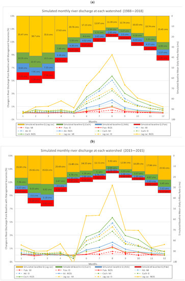 Average monthly river discharge and the changes with each scenario for (a) the entire simulation period, and (b) drought years.