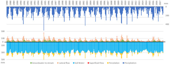 SWAT model has the capacity to generate multiple elements of the water balance, including surface, subsuface, and groundwater flows. SWAT estimated daily soil water balance, given the computed water infiltration in the soil layers for every hydrologic response unit (HRU). Figure 8 indicates the main SWAT water balance components for the Jaguari baseline including precipitation, overland flow, lateral flow, groundwater contribution to base flow, soil water, and percolation.