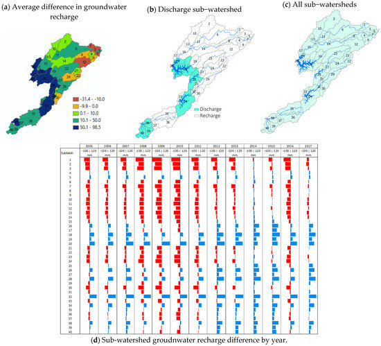 Difference between RIOS and BASELINE for groundwater recharge average for 2014–2015 (a); all CWSS contributing sub-watersheds map (b) discharge sub-watersheds only (c); Yearly difference between RIOS and BASELINE groundwater recharge by watershed (d).
