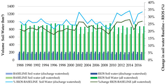 The bar chart in Figure 9d shows the behavior of all the sub watersheds in the crisis year of 2014 and 2015, where despite having a severe decrease in the amount of rain, the discharge watersheds have more water in the RIOS scenario compared to the baseline. These results support the hypothesis that NbS can contribute to overall balance, by increasing soil moisture content and associated aquifer recharge in the CWSS. Due to model limitations, it is impossible to predict how much of this water eventually will become part of the baseflow versus aquifer recharge; however, it is clear that NbS promotes overall recharge of the shallow and deep aquifers.