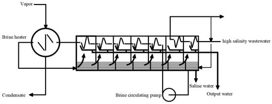 Multi-stage flash distillation (MSF) refers to the distillation desalination method of evaporating and condensing high-salinity wastewater through multiple distillation chambers in which the temperature and pressure are gradually reduced after heating [31]. Figure 1 shows the MSF process flow. The main disadvantages of this method are low thermodynamic efficiency, high energy consumption, and the phenomenon of the scaling and corrosion of equipment. Therefore, the focus of multi-stage flash research is currently mainly on reducing the energy consumption per unit. In addition, efforts should be made to solve the scaling problem of heat exchangers to further improve the heat transfer efficiency and better apply it to the treatment of highly saline wastewater.